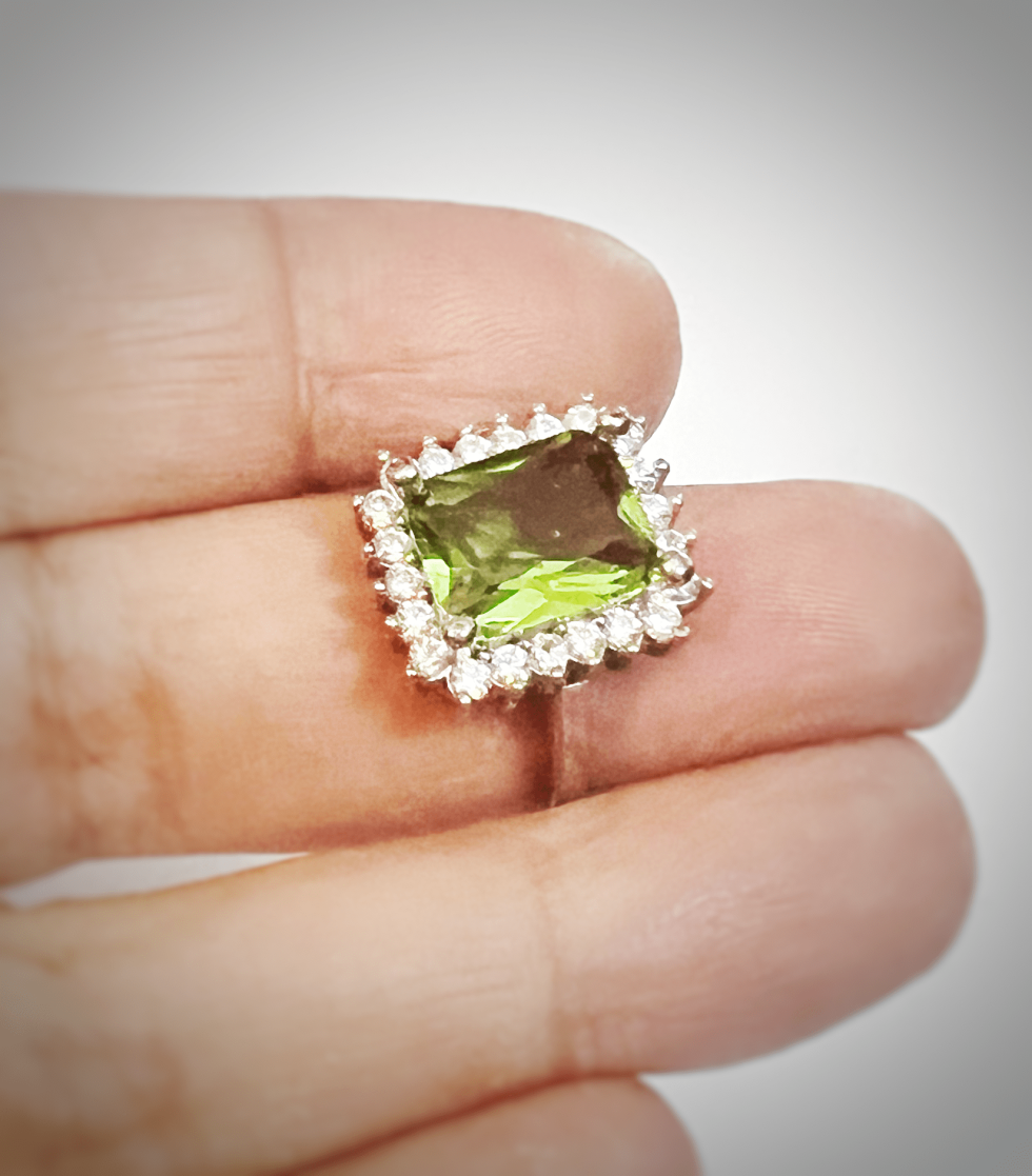 Precious stones used in the setting are Zultanite and Cubic Zircon. Zultanite is an extremely rare, transparent gemstone from the Diaspore mineral family, which can show the colours yellow, cognac, pink or red. It is a colour changing stone which changes its colour depending on the light it is in. Turkey is the only place where the gemstone can be found.
